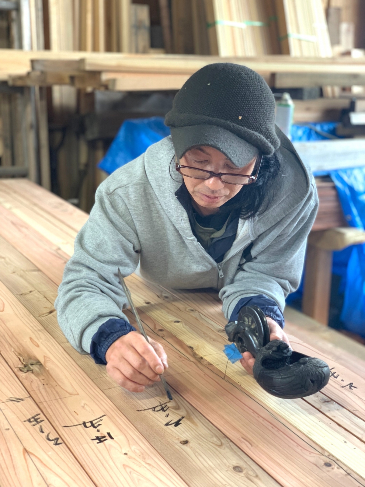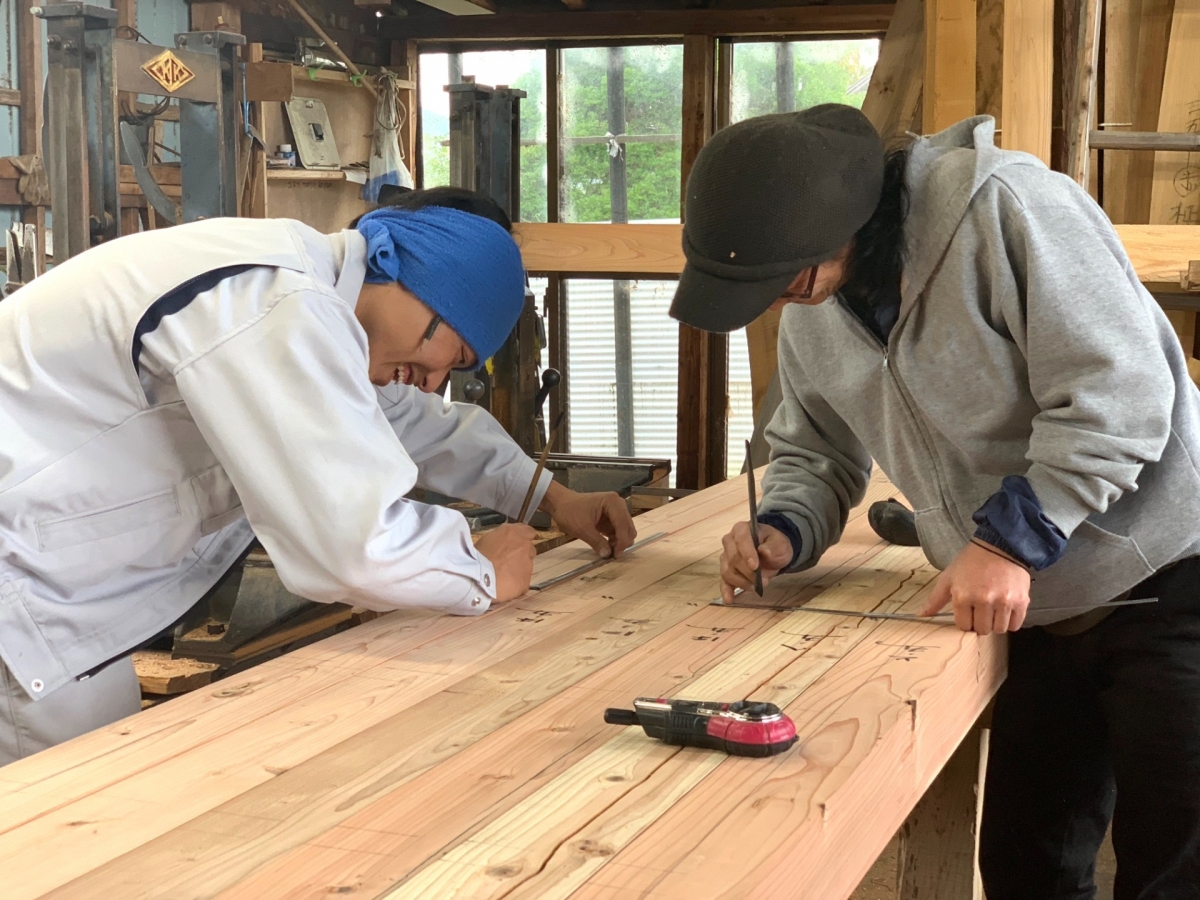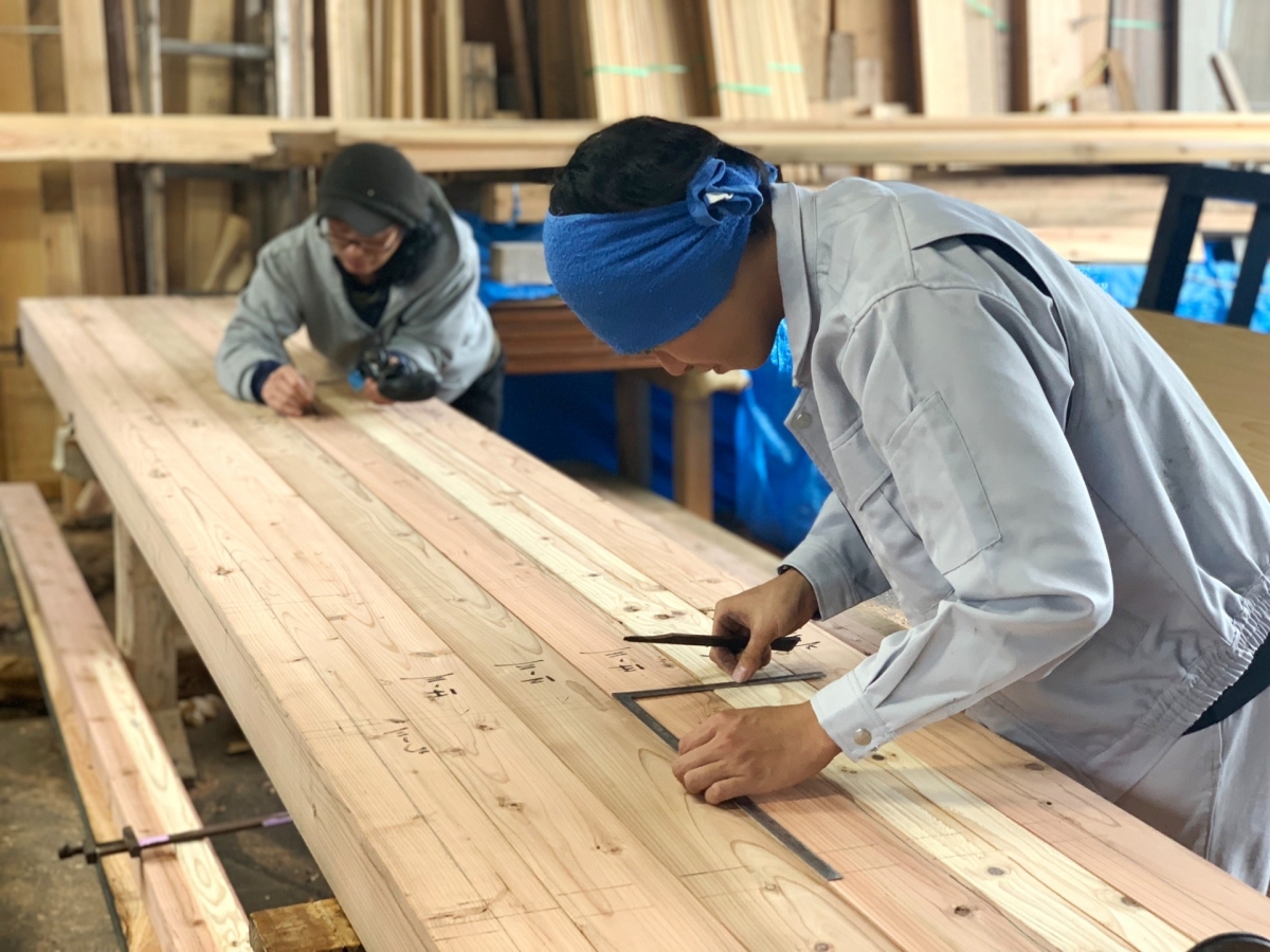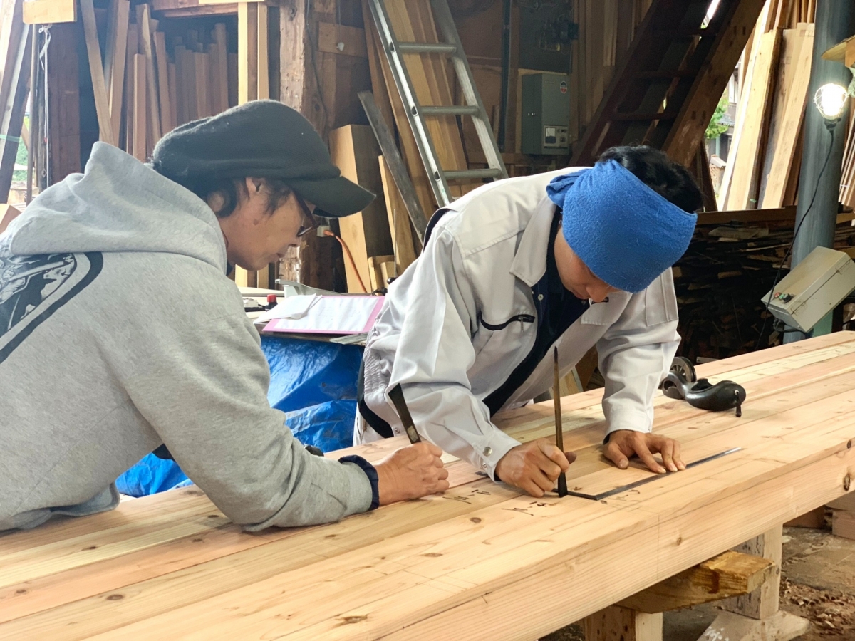 ベテラン大工さんと若手大工さんが木材への墨付け作業を行っていました。