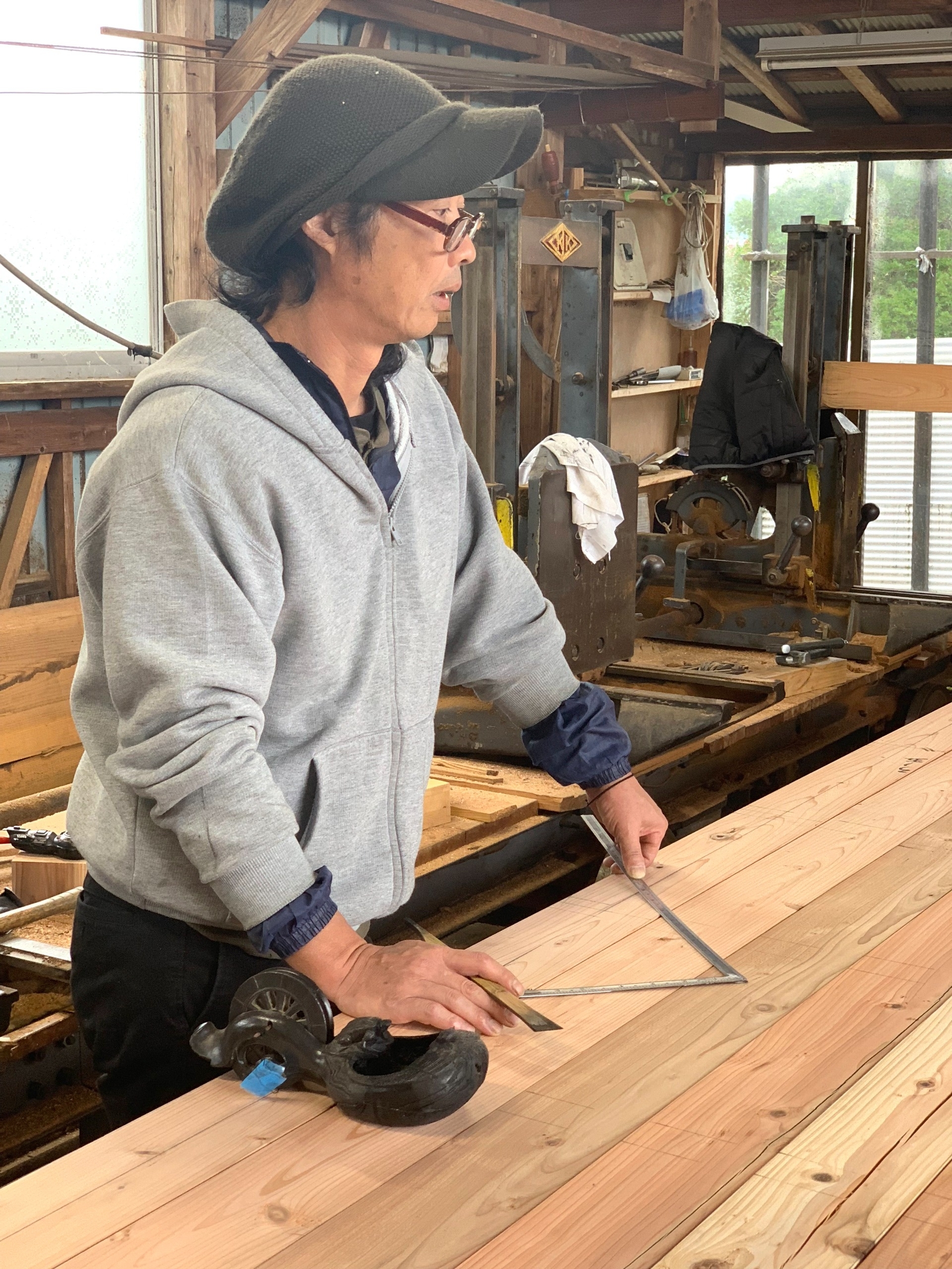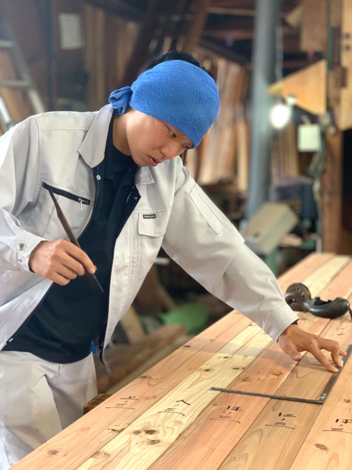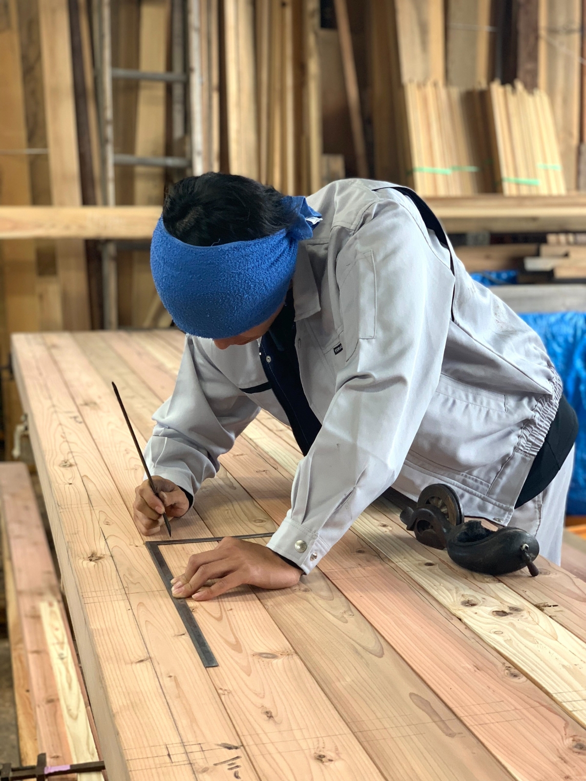 ベテラン大工さんと若手大工さんが木材への墨付け作業を行っていました。