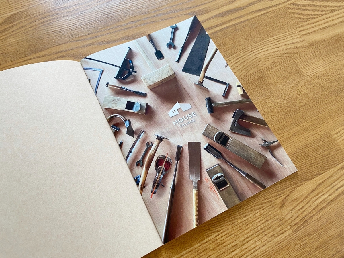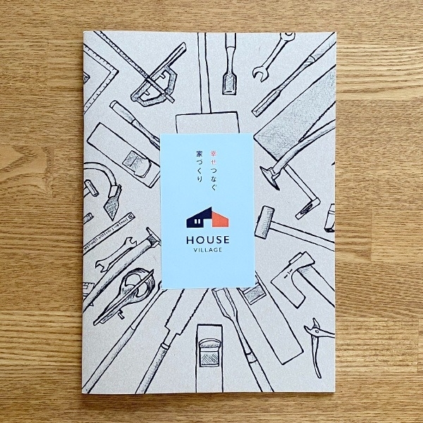 大工さんの道具イラストが目印の新築施工例パンフレットでは
