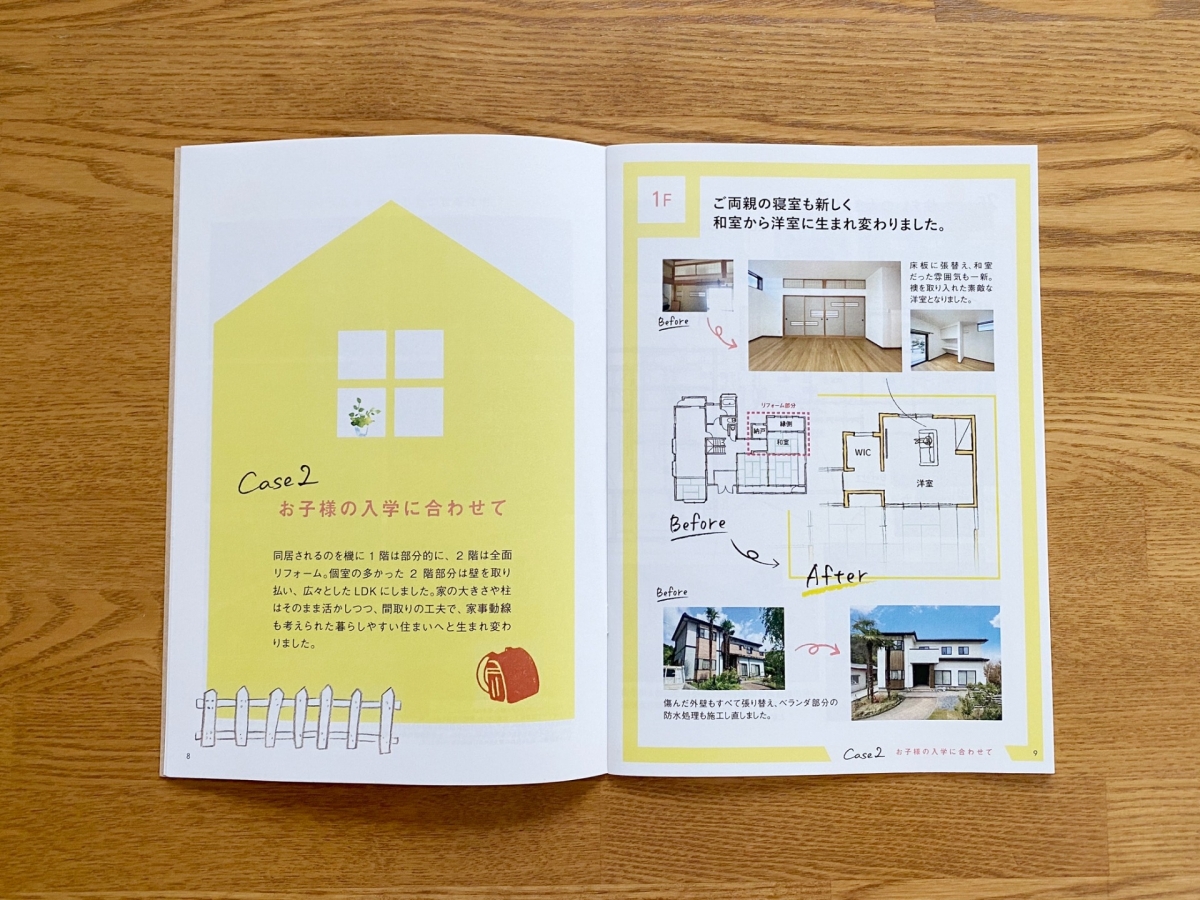 家型のマークが目印のリフォーム施工例パンフレットでは、施工例を6件掲載。