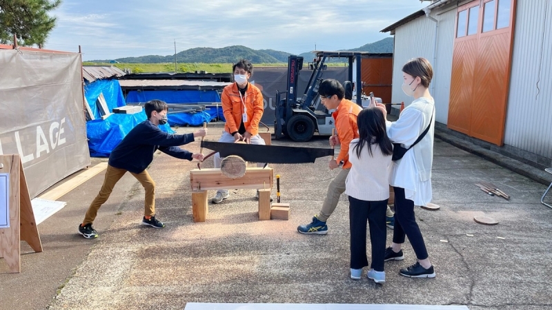 二人で一本の丸太を切る専用ののこぎりを使った丸太切りを体験。