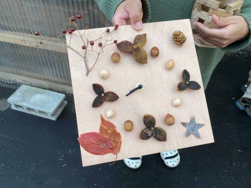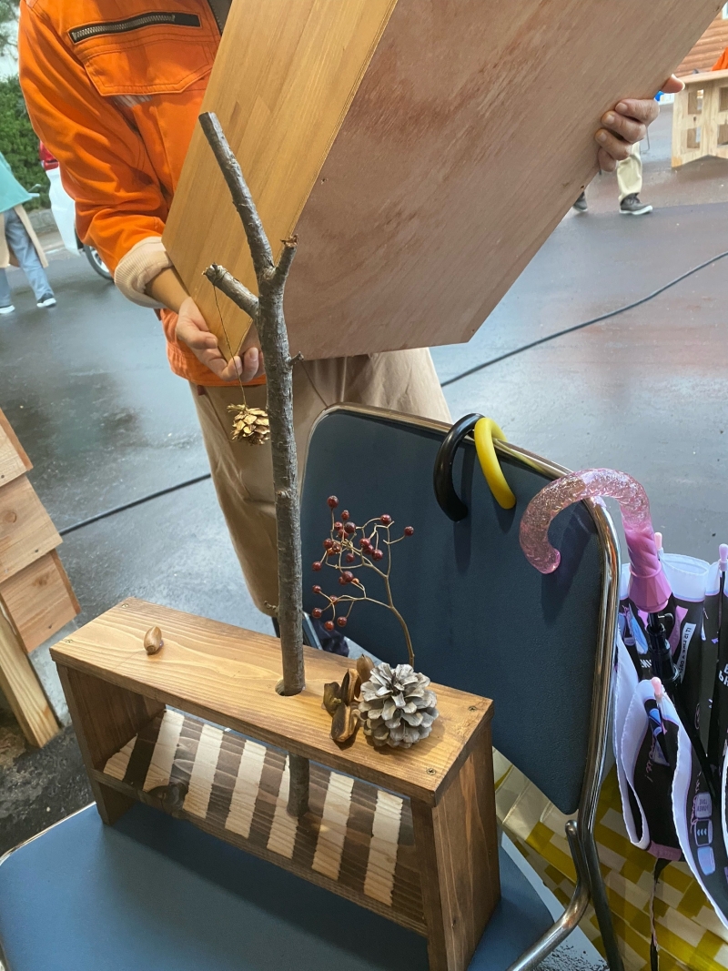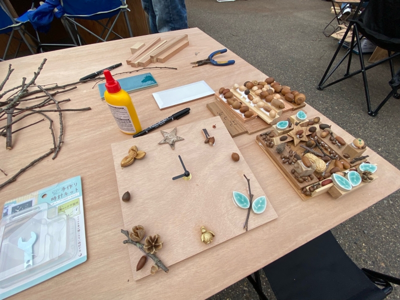 クラフトコーナーでは、木材の木っ端やどんぐり、松ぼっくりなどを使い