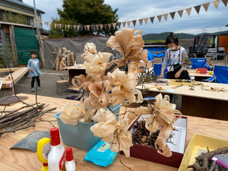 また家づくりの際に出たカンナ屑を使い、ポンポンやお花など、自由なクラフトを楽しむコーナーも。