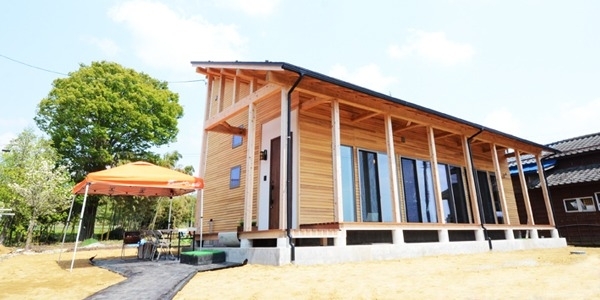外壁には杉材を使用し、全面に張り巡らされています。