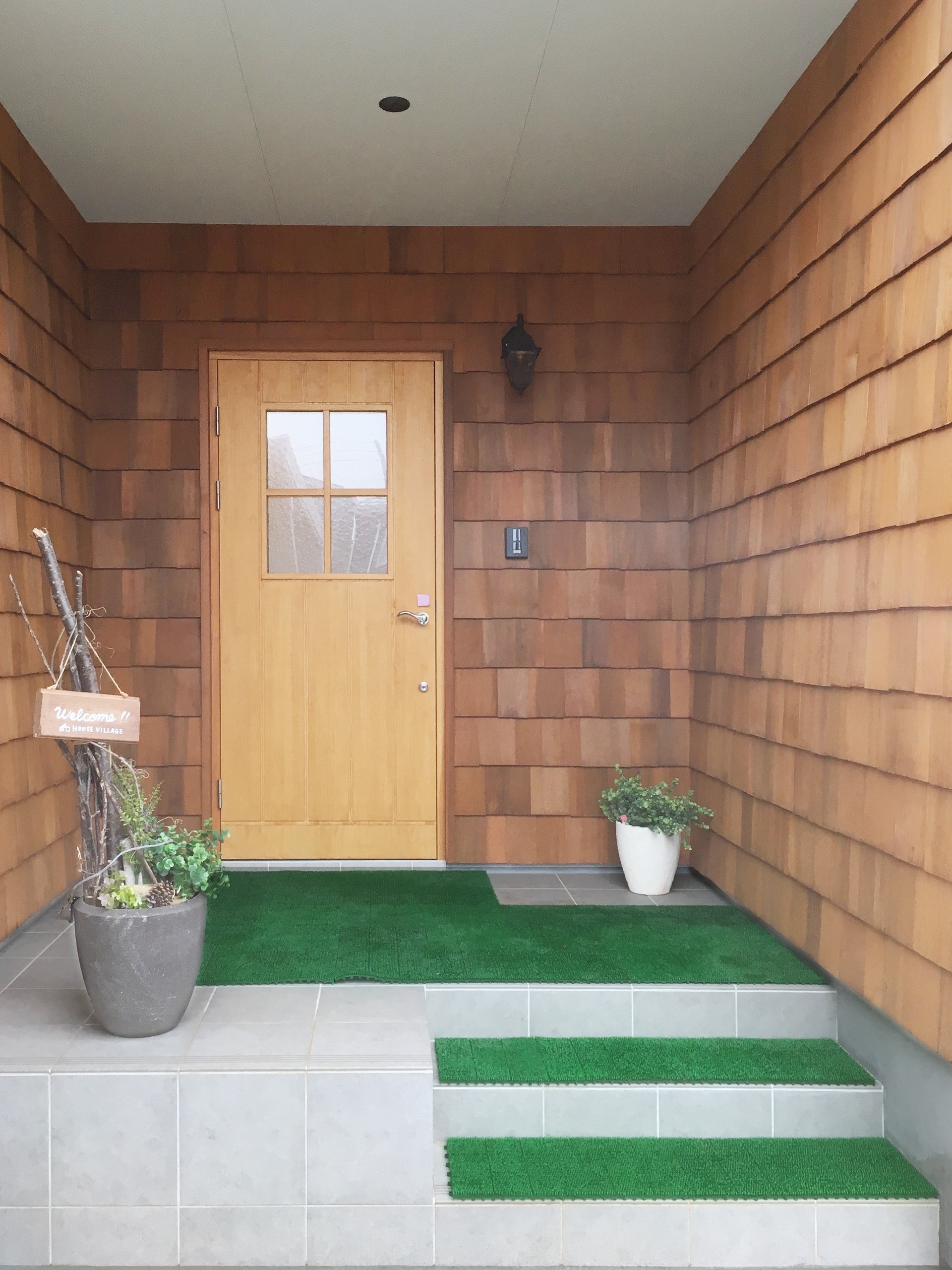 ウッドシングルを貼った玄関ポーチが印象的なお家で