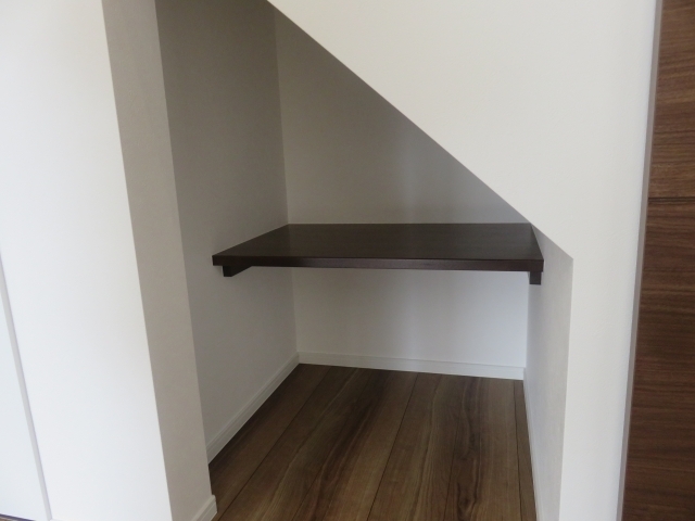 階段下収納は、天井の高さが一定でない場合が多く、奥に進むにつれて天井が低くなる形状をしています。