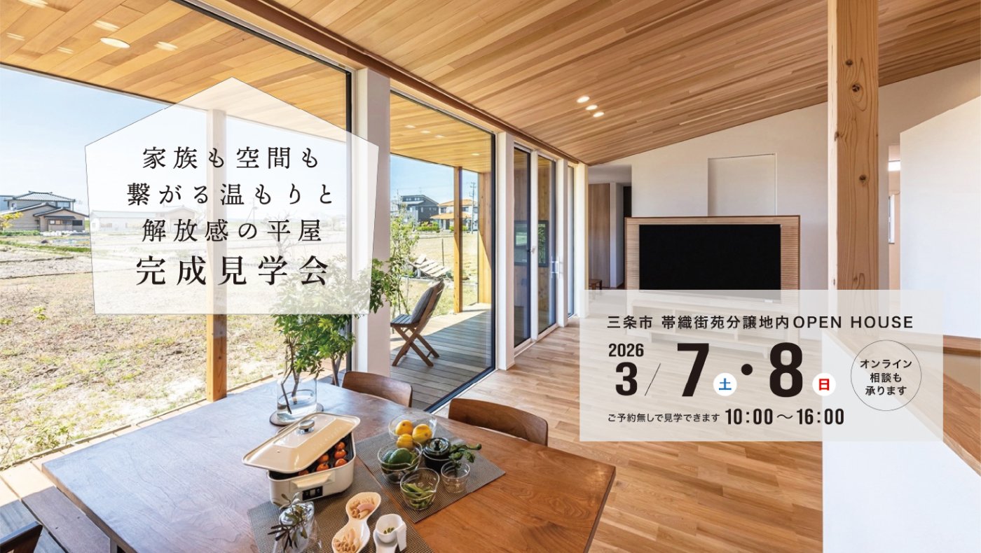 “家族も空間も繋がる温もりと解放感たっぷりの平屋”の完成見学会を開催いたします。