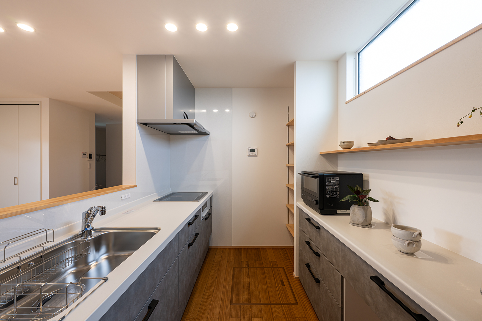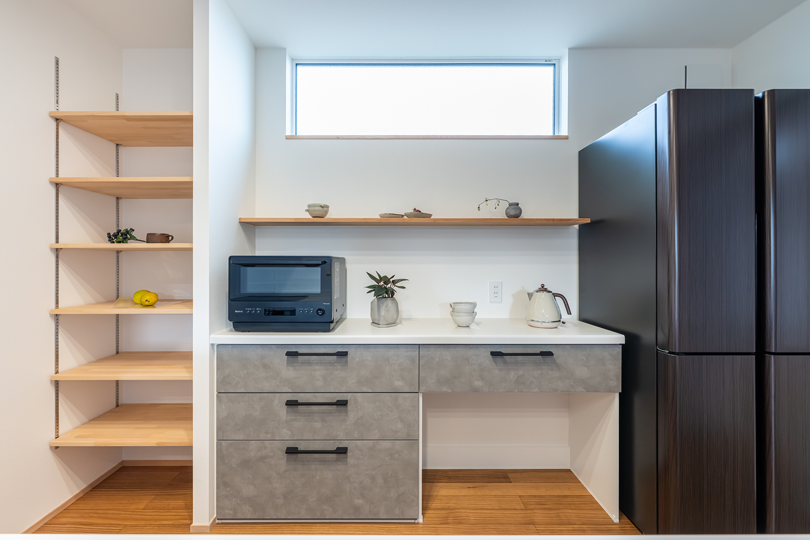 キッチン背面の収納スペースには、パントリースペースも設け、ストック品などを片付けます。