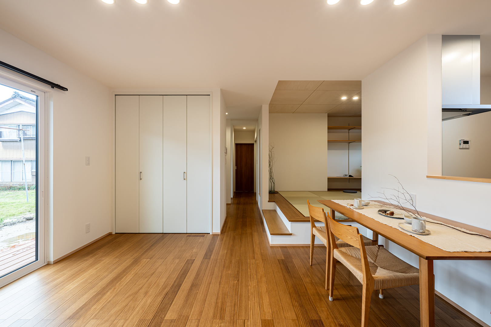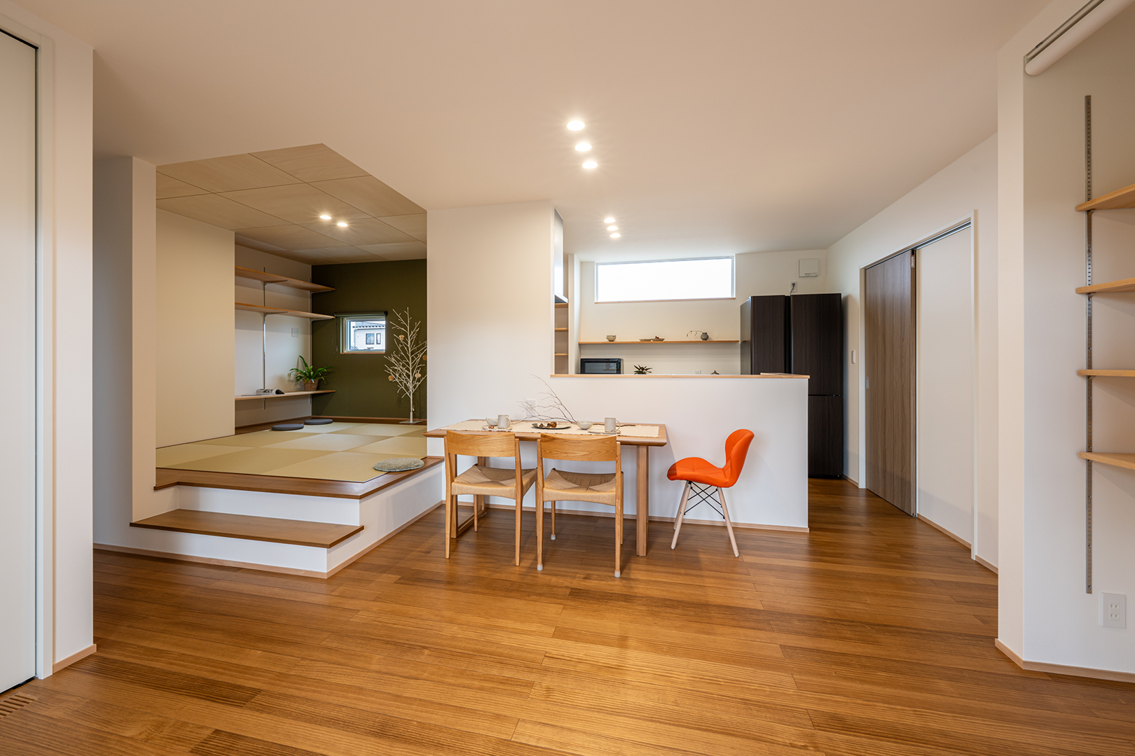 小上がりなどの段差を入れることで、スペースごとのメリハリをつけています。