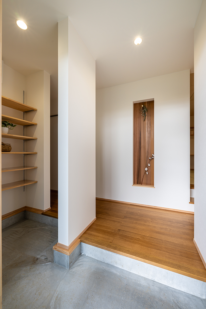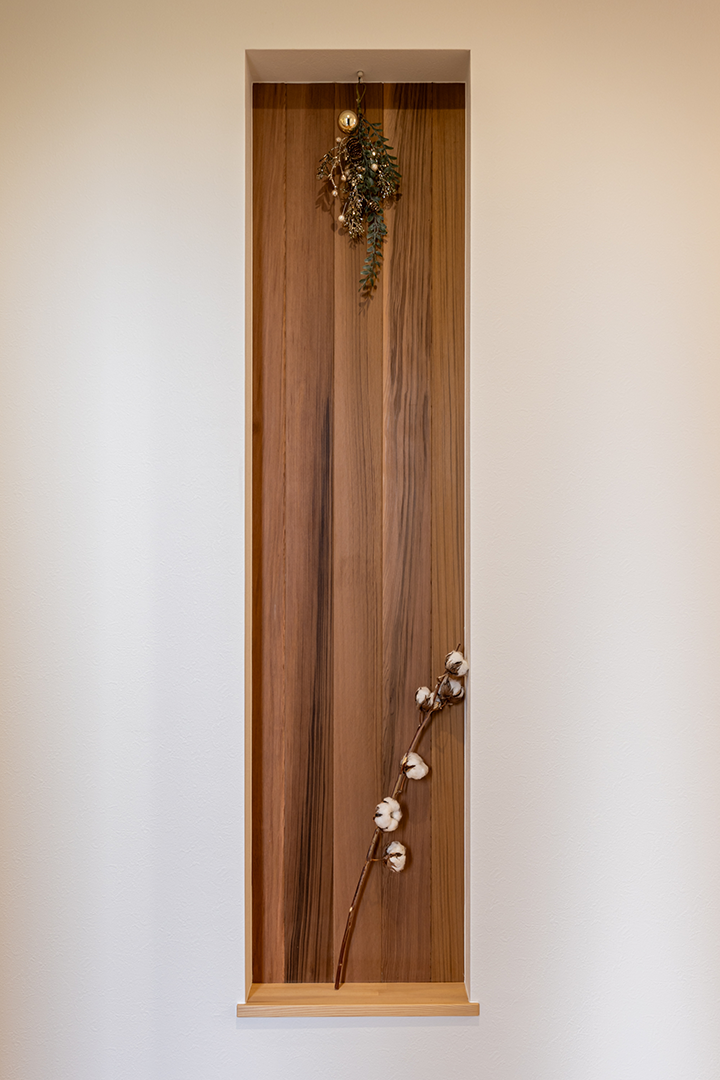 玄関正面にはアクセントニッチを取り付け、季節のインテリアを飾ります。