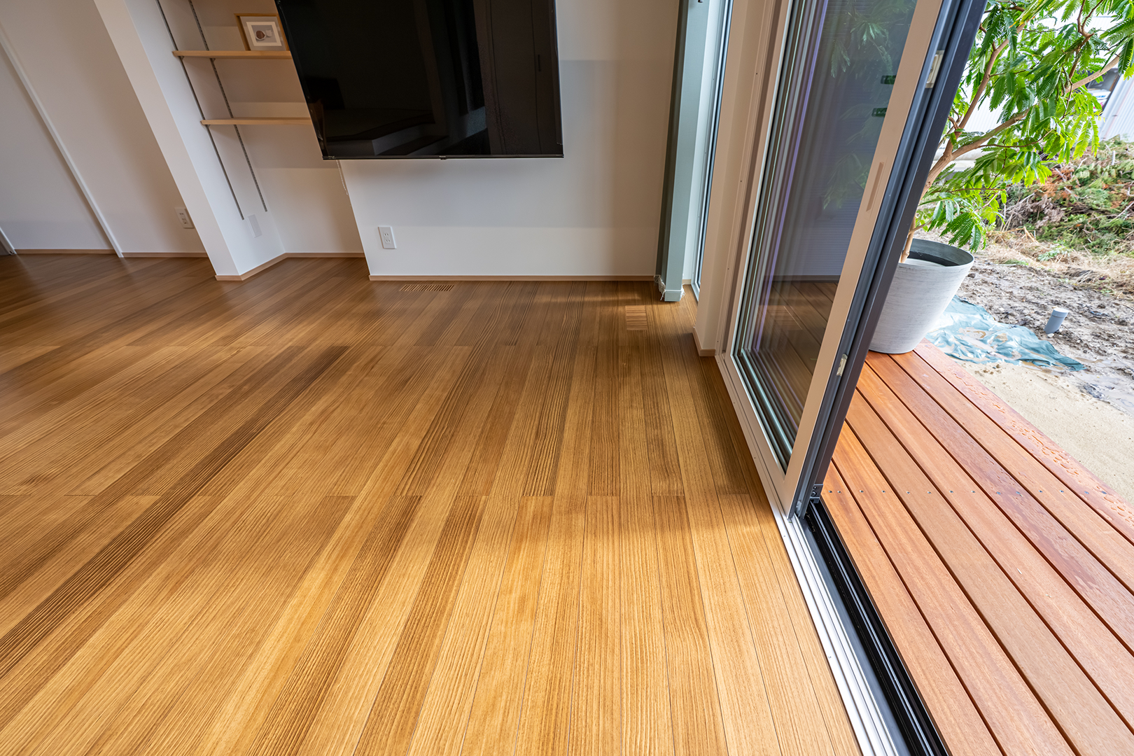 床は木の味わいと触れ心地を楽しめる浮造りの無垢フローリング。