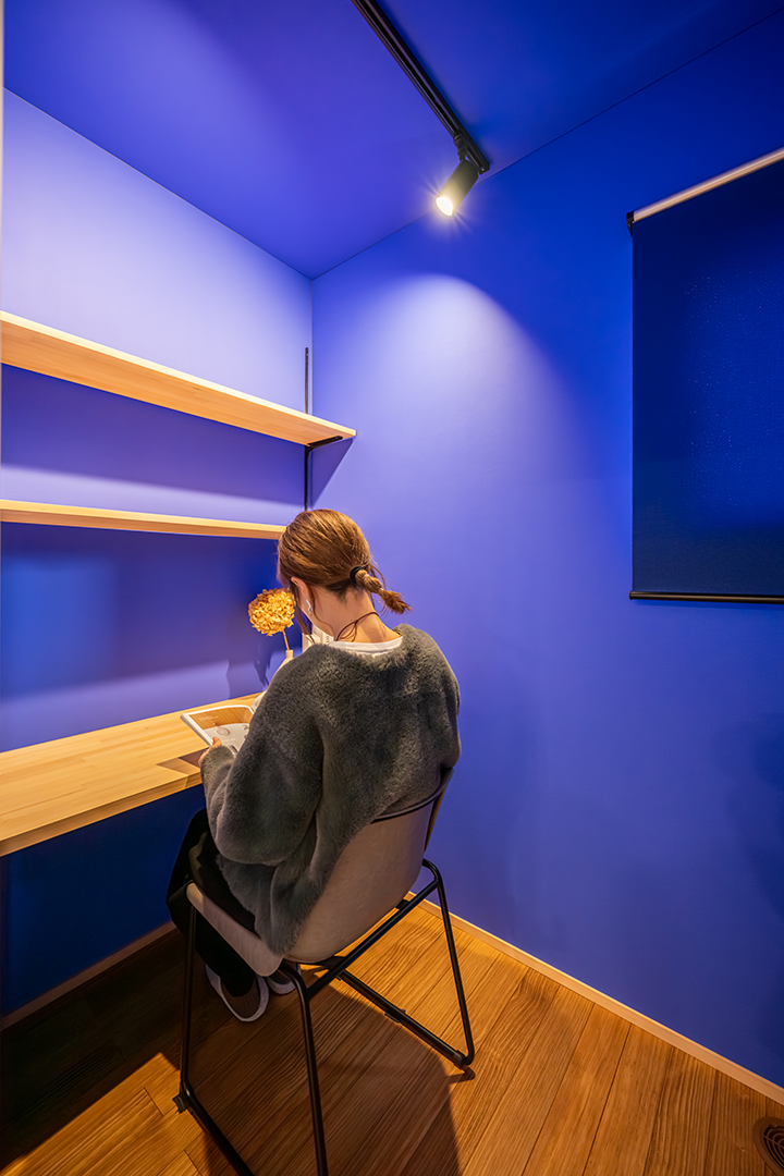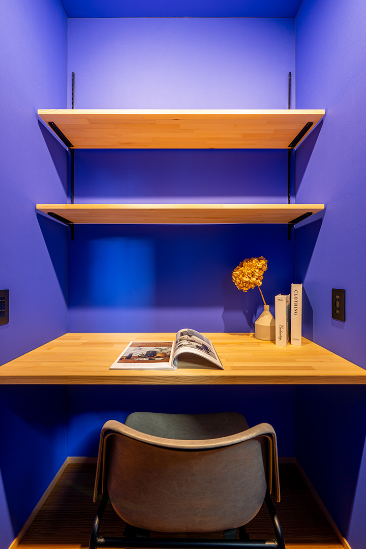 プライベート書斎はブルーの壁紙に囲まれた個性的で素敵な空間。