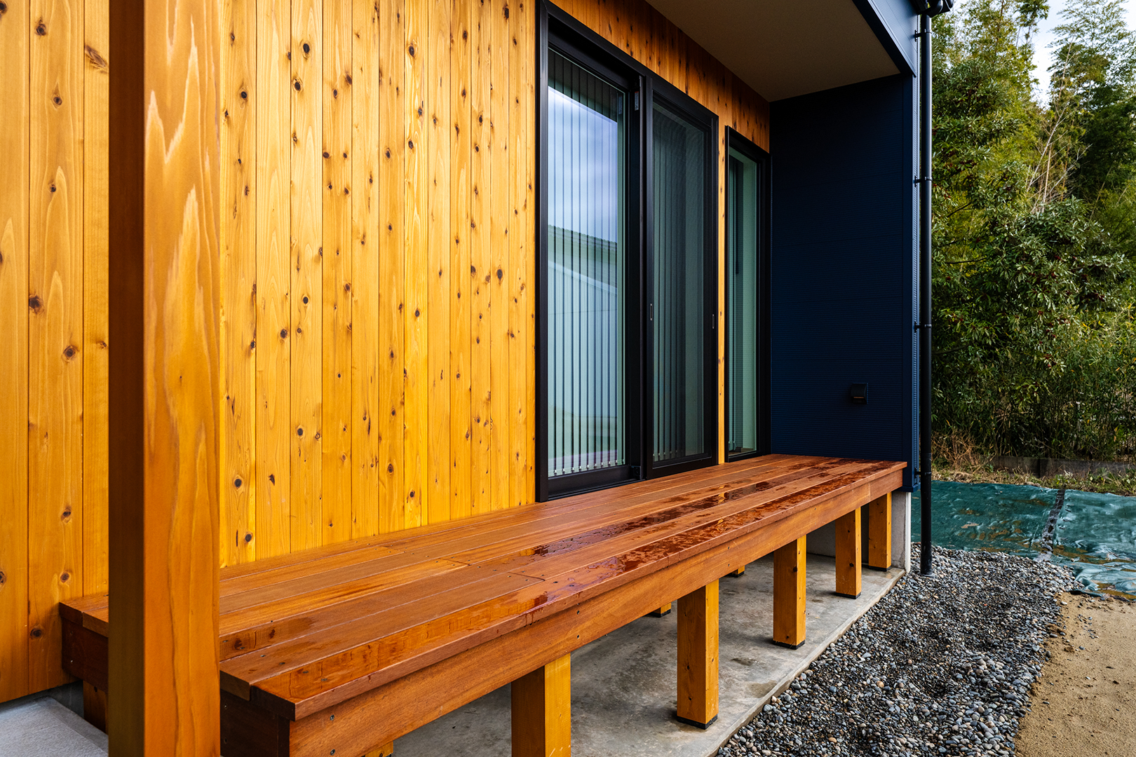 横長スタイルの平屋は建物に落ち着きを感じさせます。板張りが上質なアクセントに。