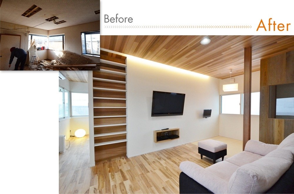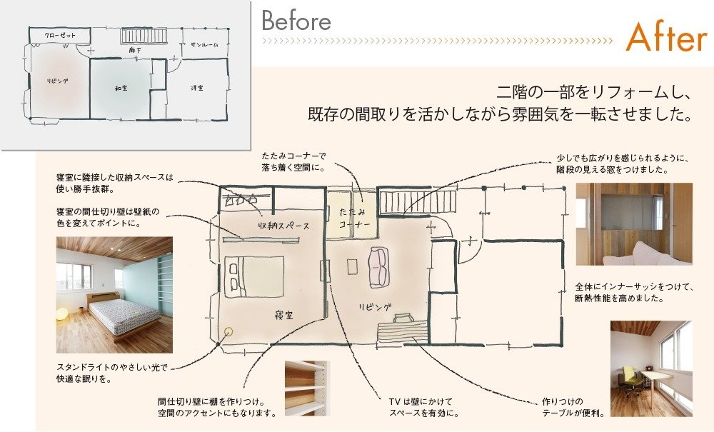 既存の間取りを残しつつ内装を一変させ、畳スペースを確保するなど