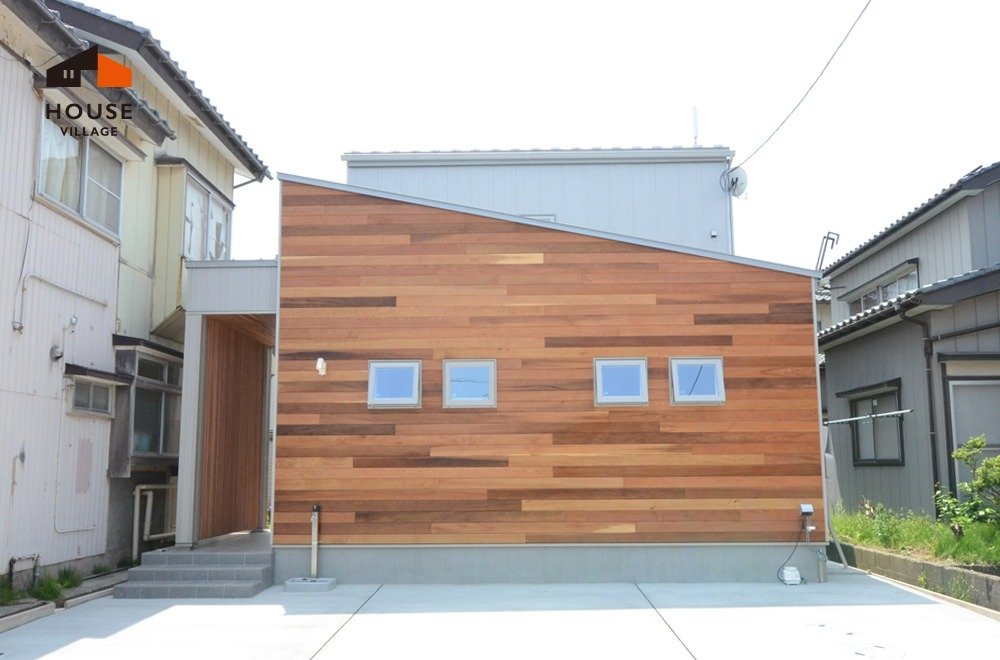 外壁の一面にはウエスタンレッドシダー材をパネリングし、個性的な外観となりました。 板の一枚一枚色味が違い、バランス良く張り合わせのにセンスが必要となります。