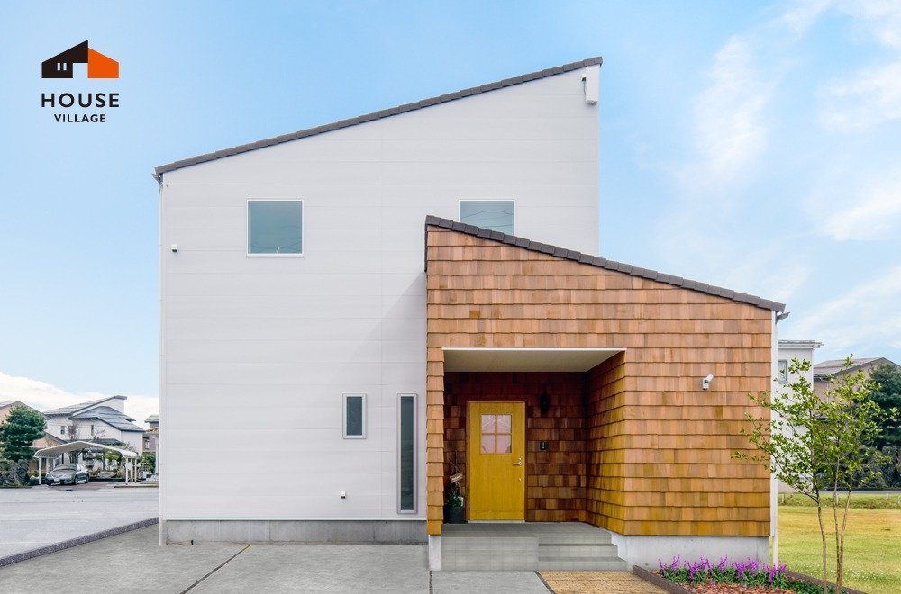 玄関周りの外壁にはおしゃれなシダーシェイクが施され、