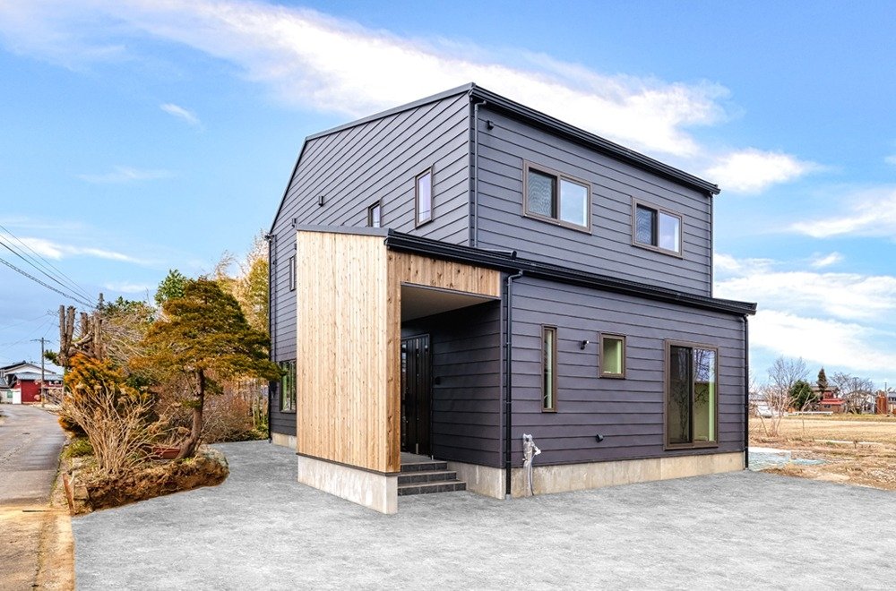 黒のガルバリウム鋼板にウエスタンレッドシダーの木目がアクセントになっています。