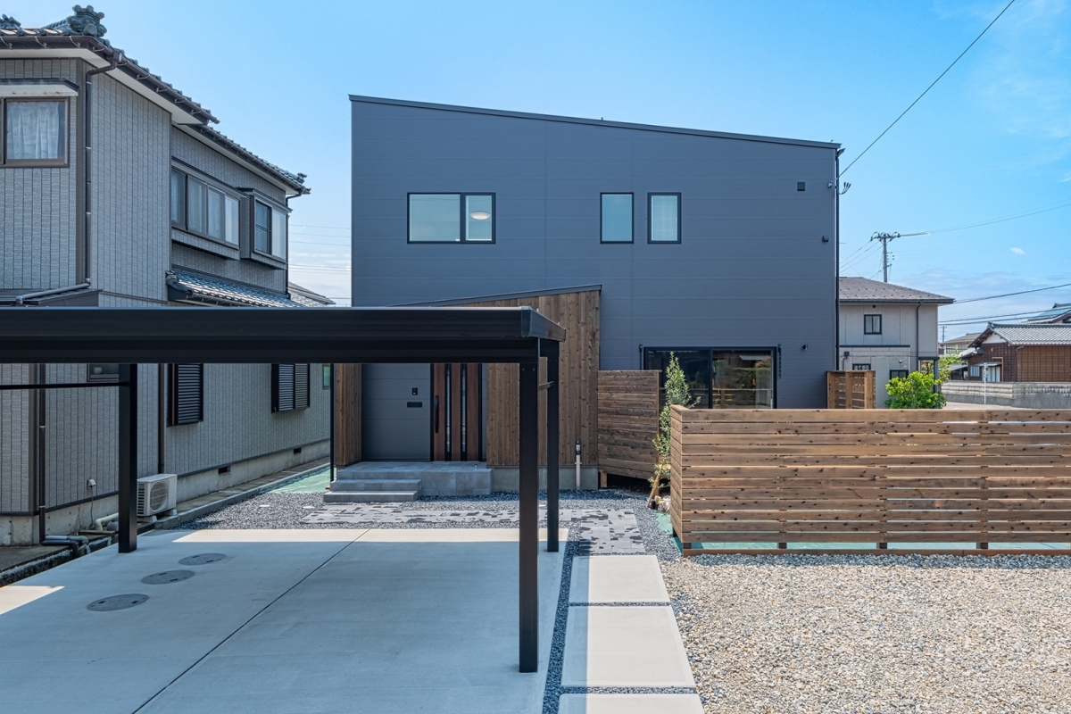 黒くシャープな外観の雰囲気に合わせて、ランダムサイズのタイルを組み合わせたデザイン性の高いアプローチを作りました。