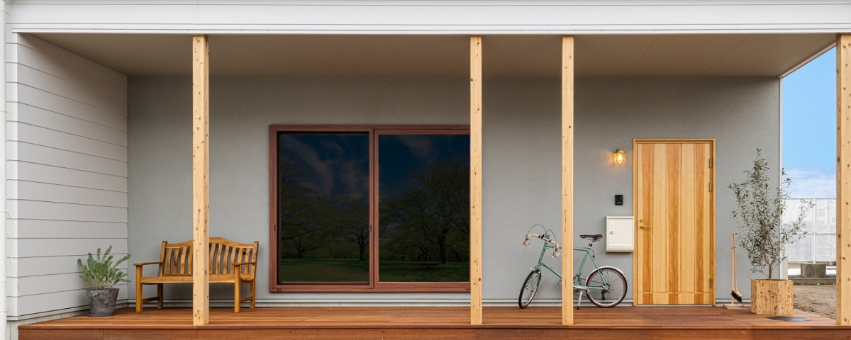 室内と庭をつなぐ大きなウッドデッキ。大きな屋根もかかっているので、リビングの一部かのように自然に外へ繋がっています。