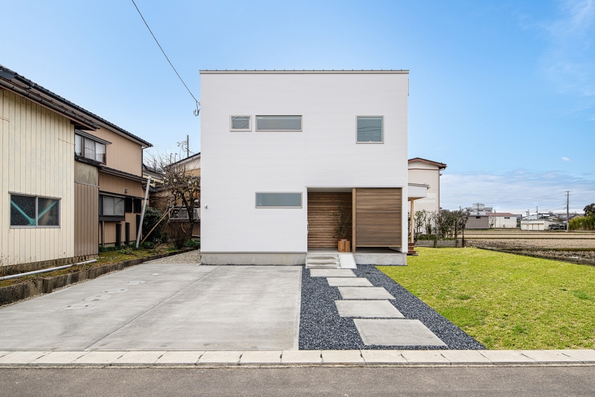 真っ白な四角いフォルムに玄関ポーチの木材がアクセント。