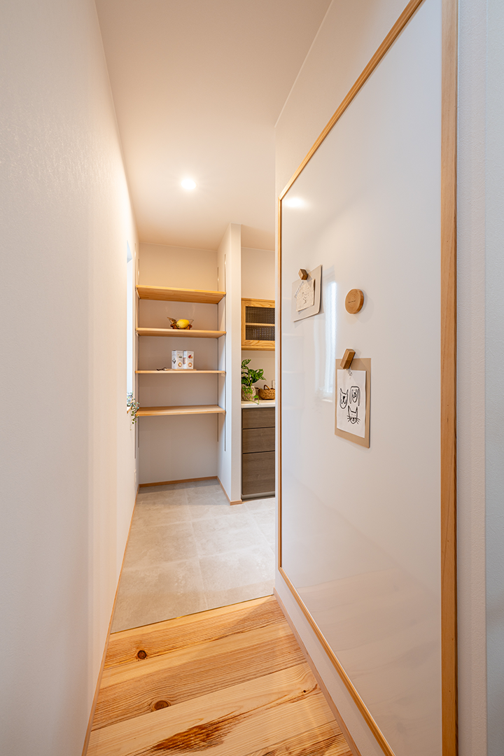 壁面にホワイトボードを取り付け、家族のコミュニケーションスペースに。