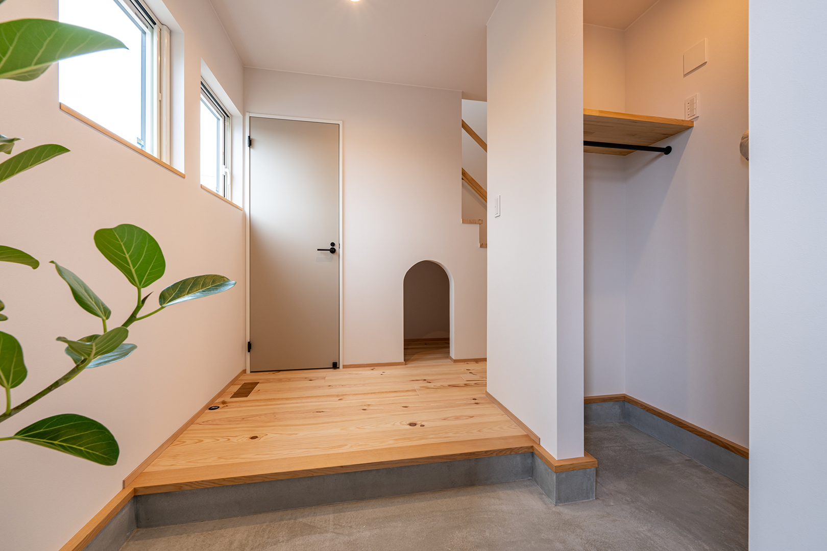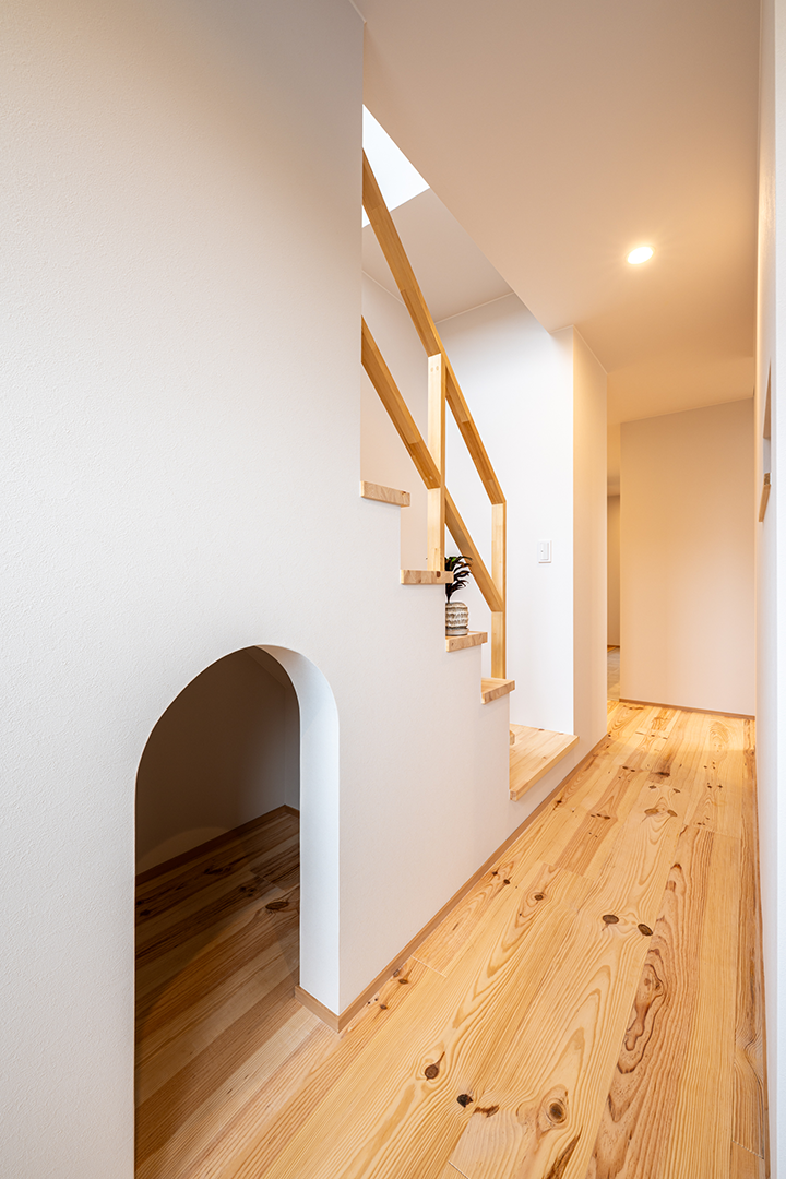 階段下のスペースを使ってR開口のかわいい収納を設けました。