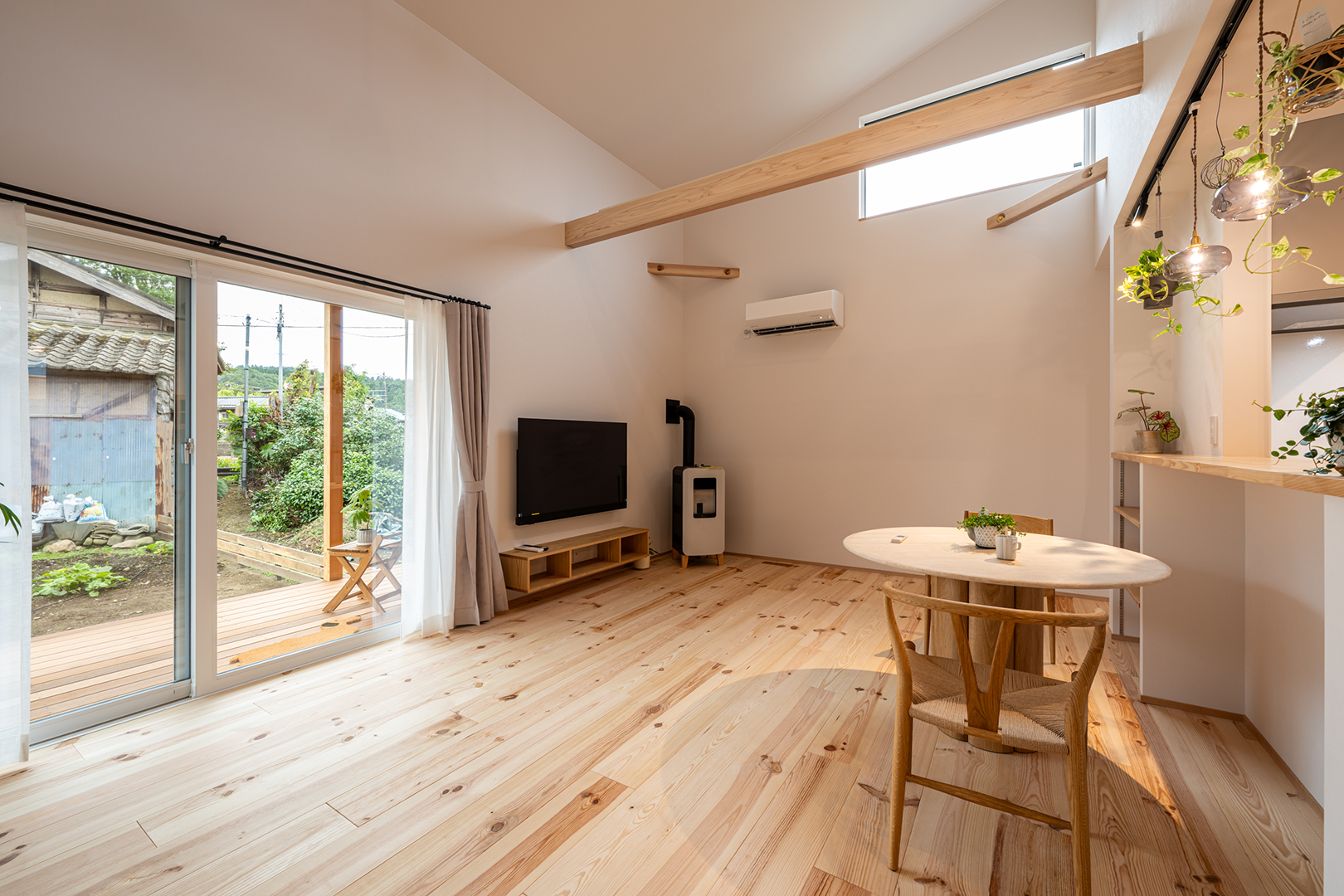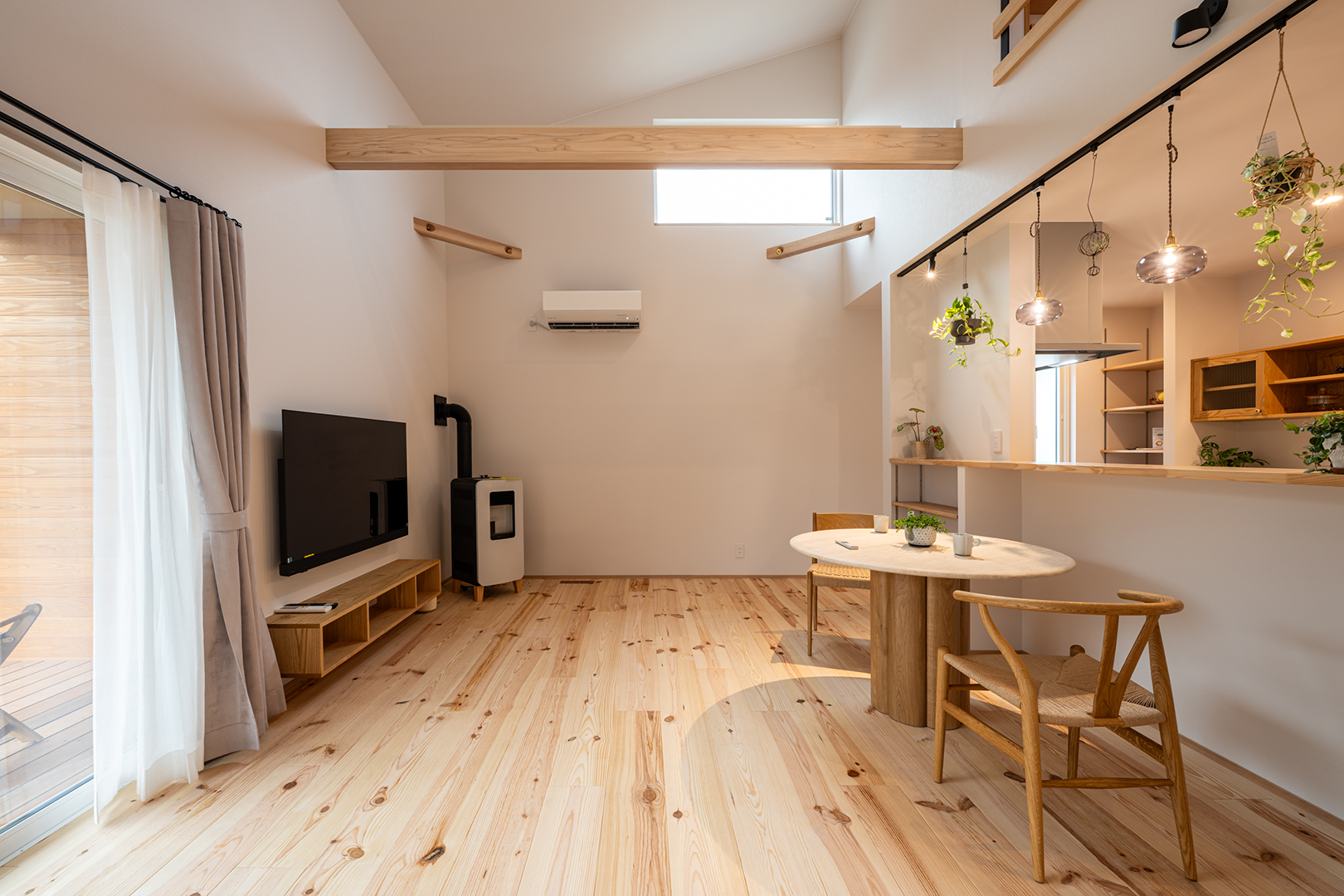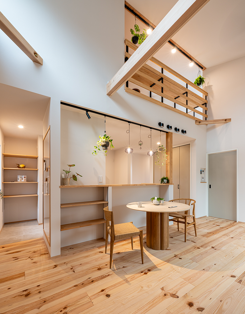グリーンを飾ったりハンモックを吊るしたりと楽しみが広がる梁を表しにしました。