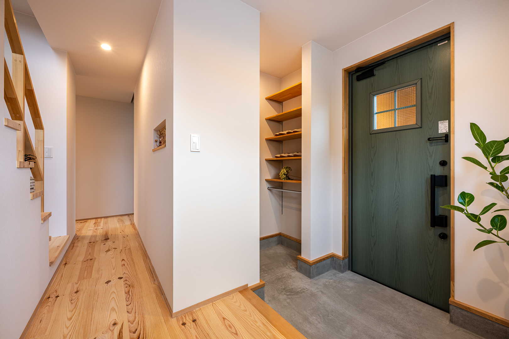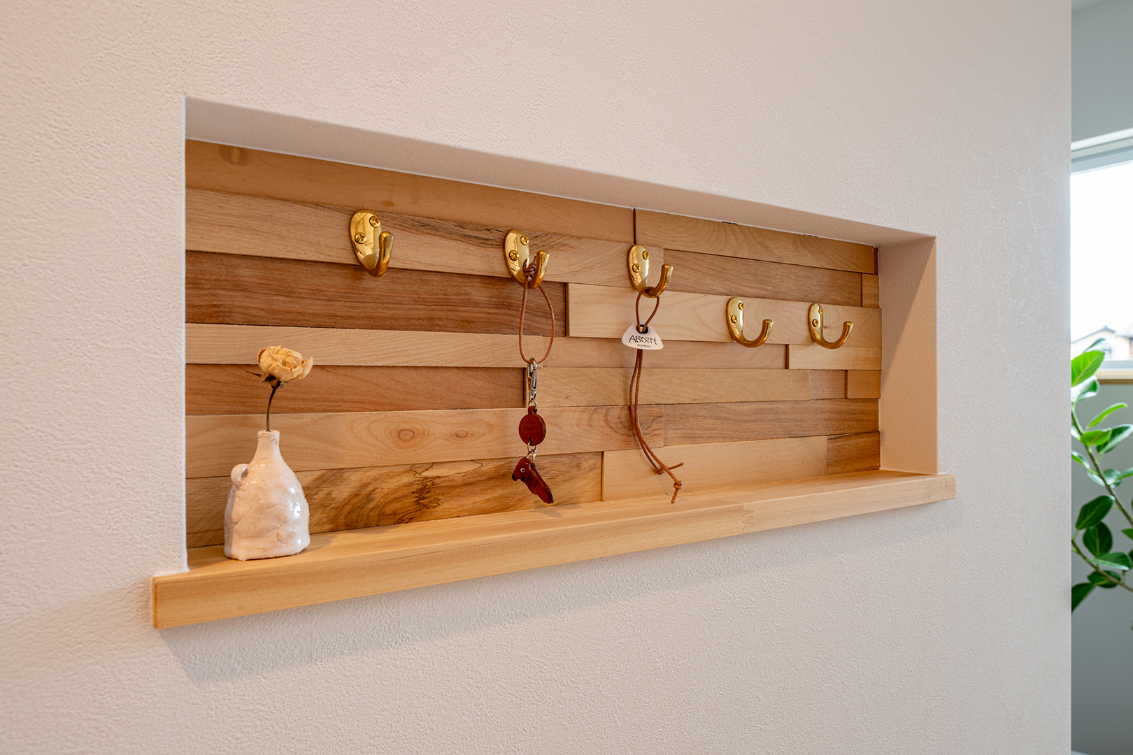 壁面にインテリア性の高いニッチを取り付け、鍵などをかけておけるフックを取り付けました。