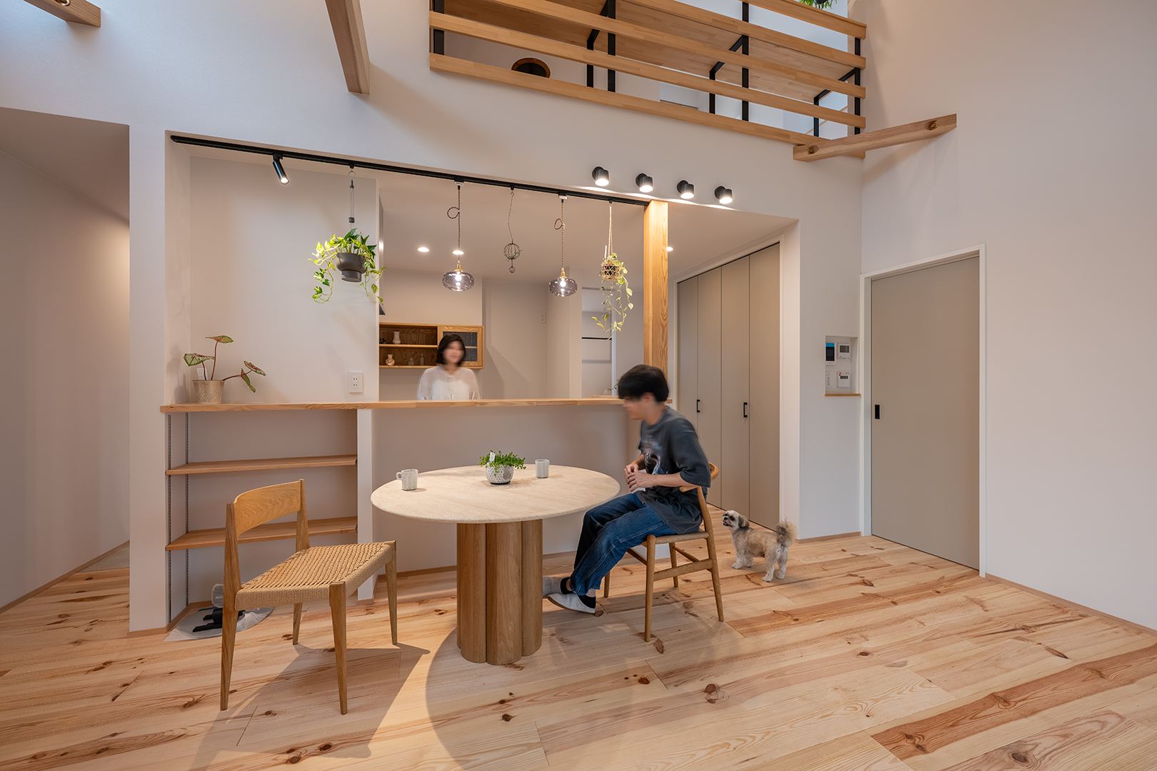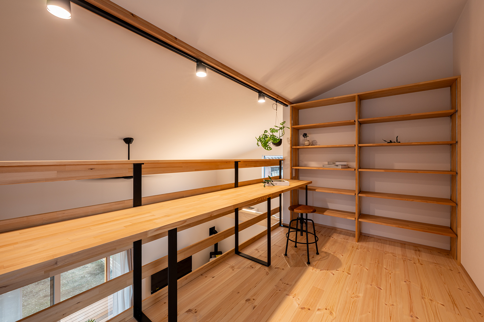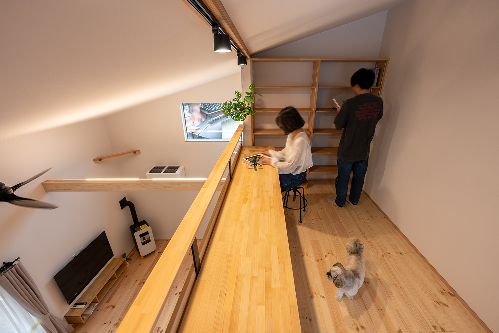吹き抜けの2階にはカウンターデスクと本棚を造作し、ご家族で過ごす大切な空間となりました。