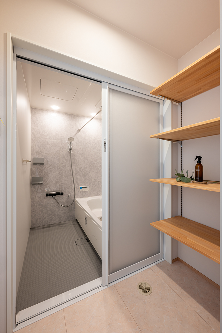 脱衣スペースには可動式の棚を取り付け、ストック品なども高さを合わせて収納できます。