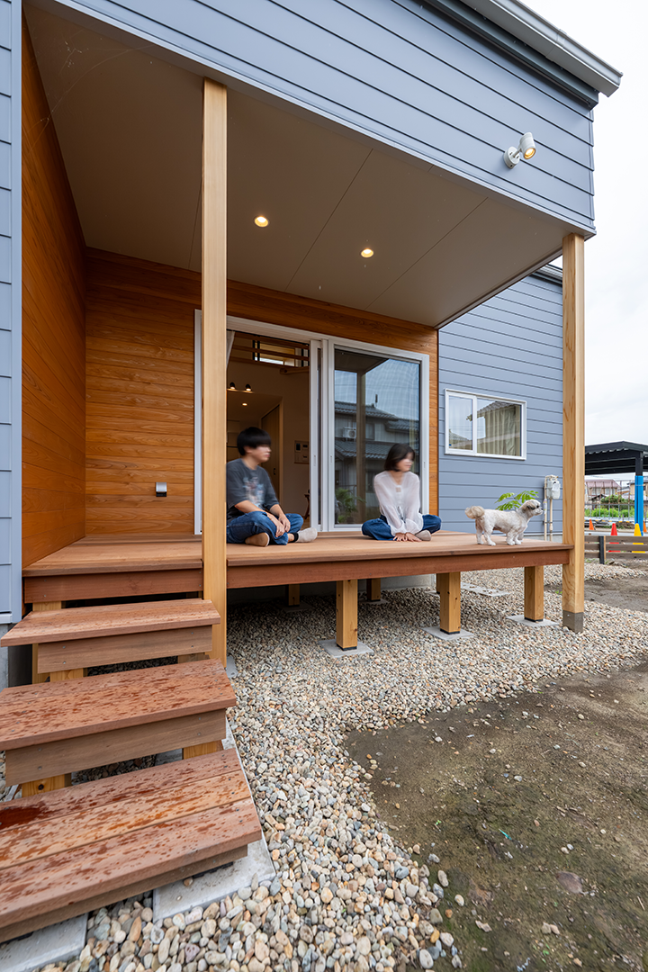 お庭(ドッグラン)へとつながる、屋根付きのウッドデッキ。