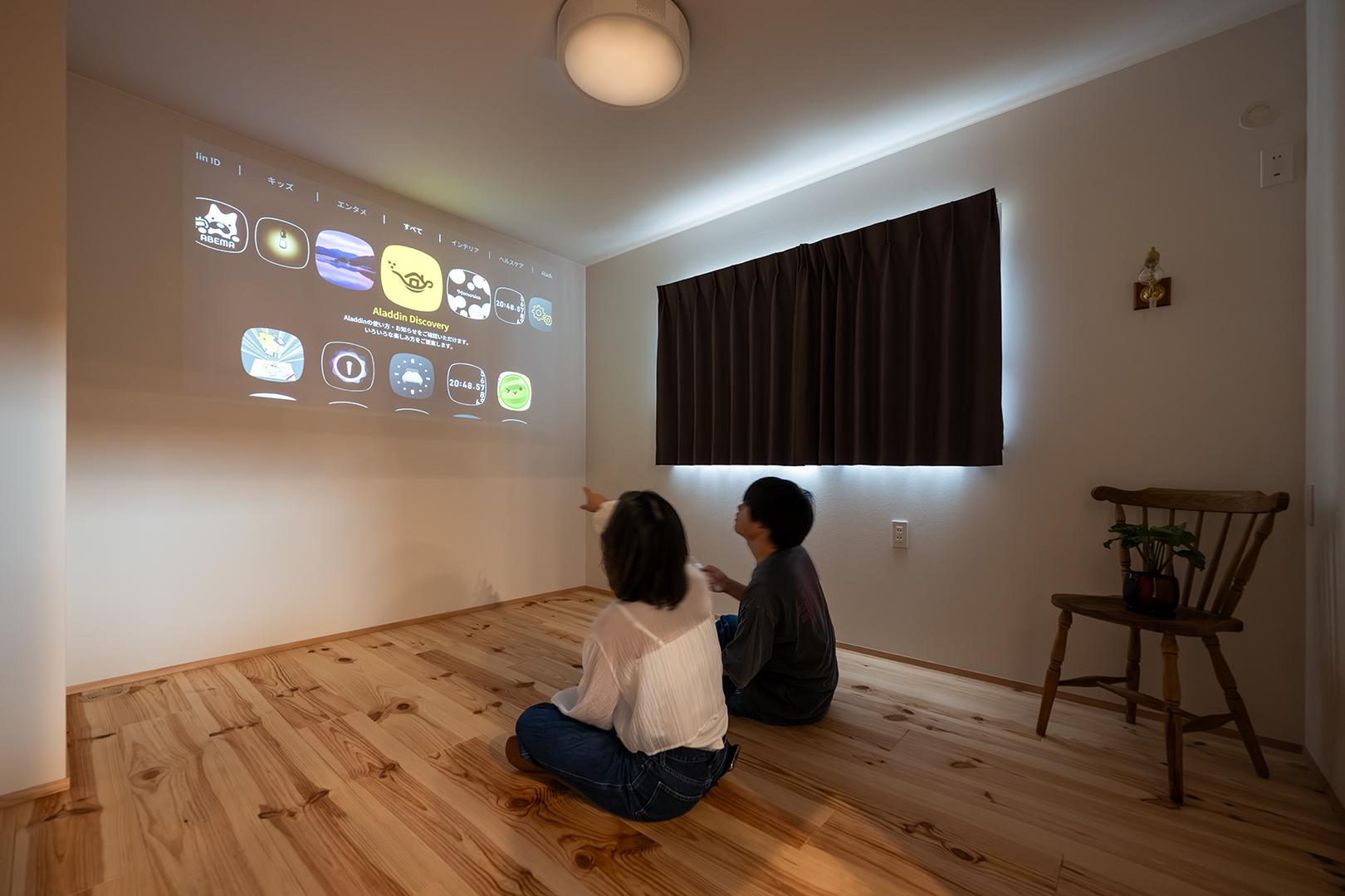 天井付きプロジェクター内臓の照明で、映画や動画を楽しめます。