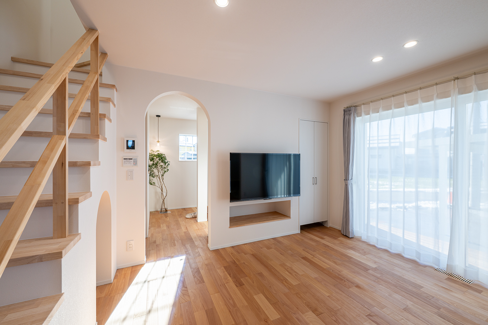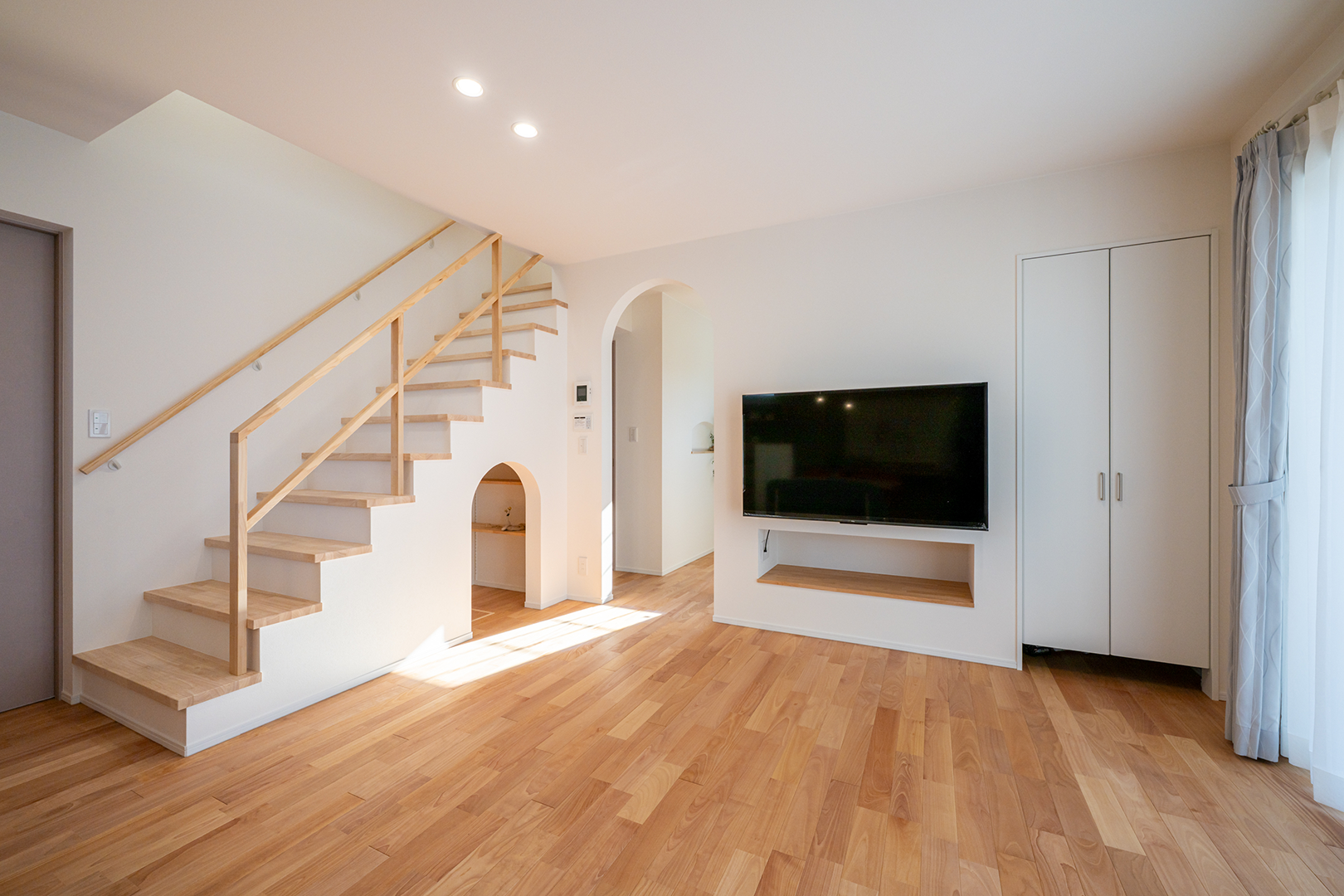 壁掛けテレビの下にニッチを造り付け、テレビボード代わりに。
