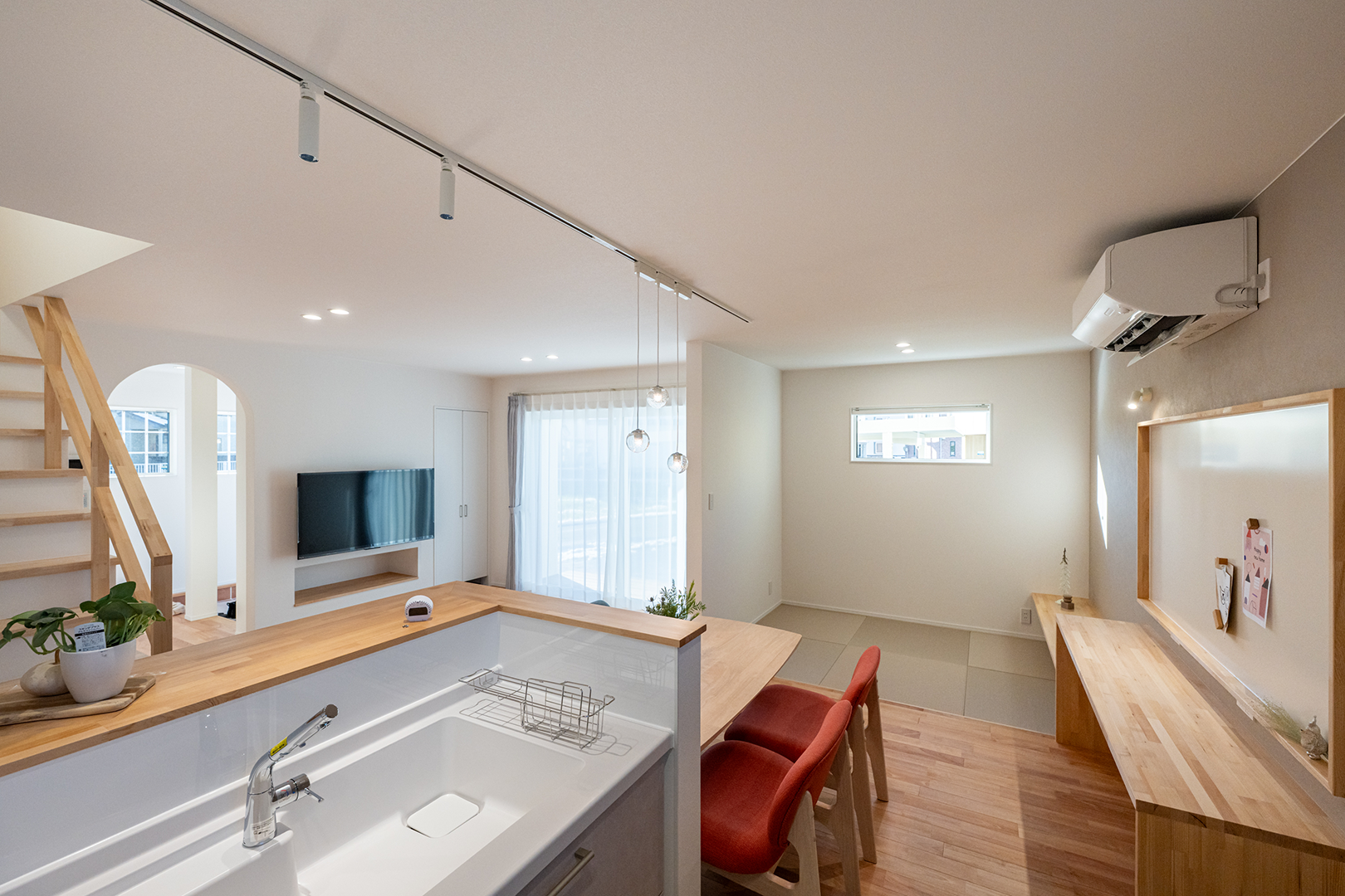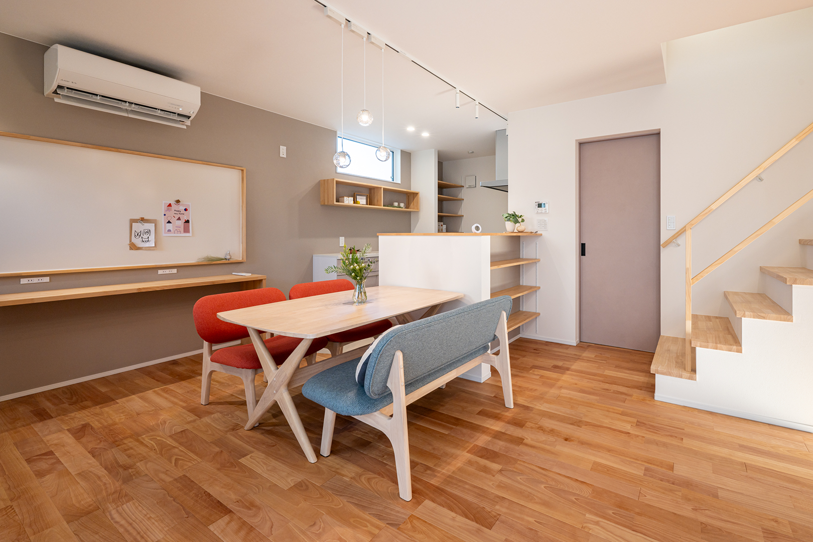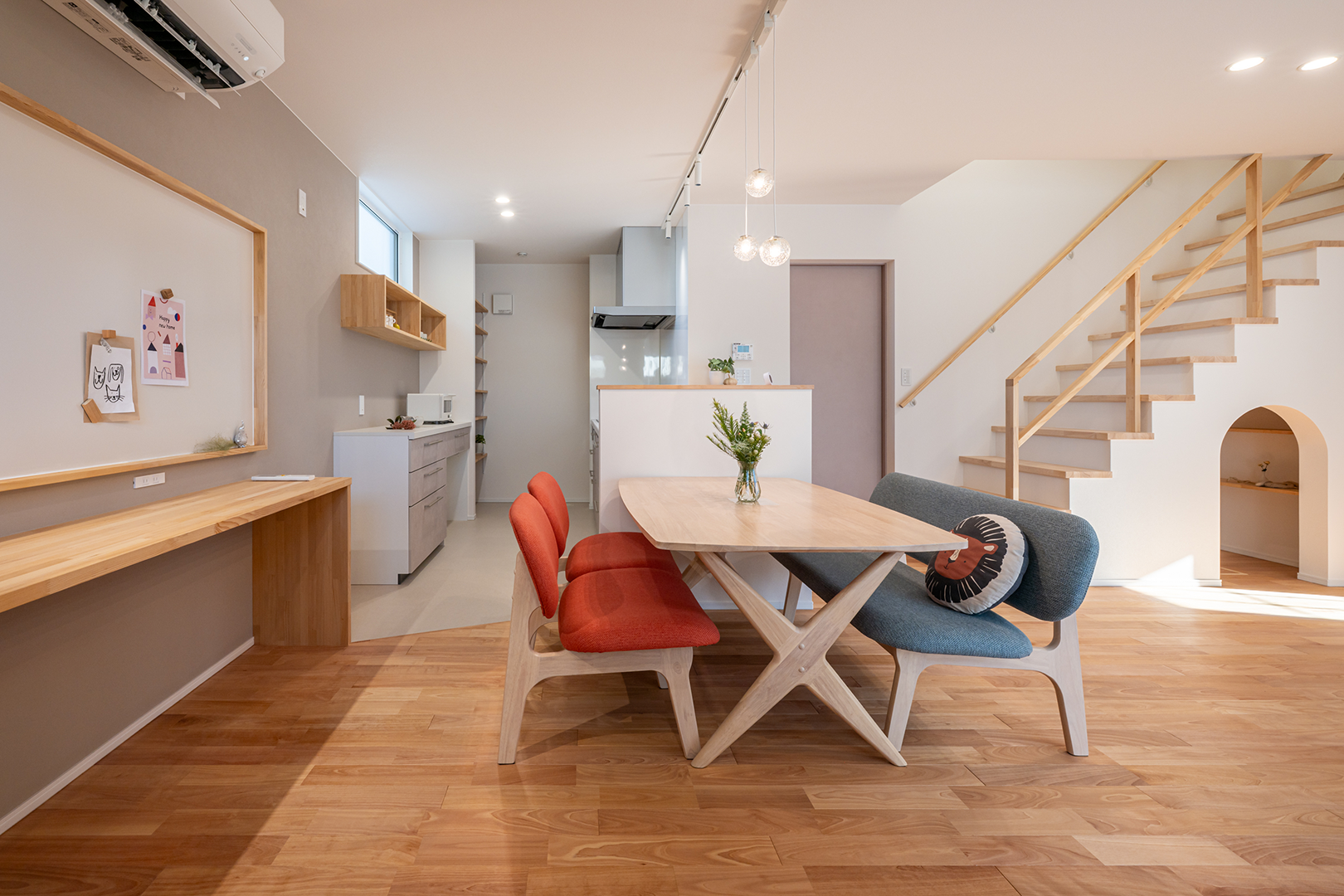 ダイニングの背面にはカウンターデスクと大きなホワイトボードを取り付け、ご家族みんなでお絵かきや読書などに使えます。
