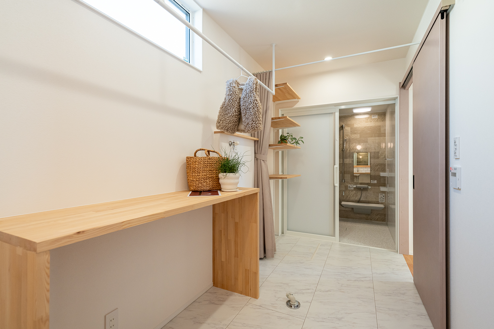 脱衣スペースはカーテンで仕切ることができ、普段は解放して広々使えます。