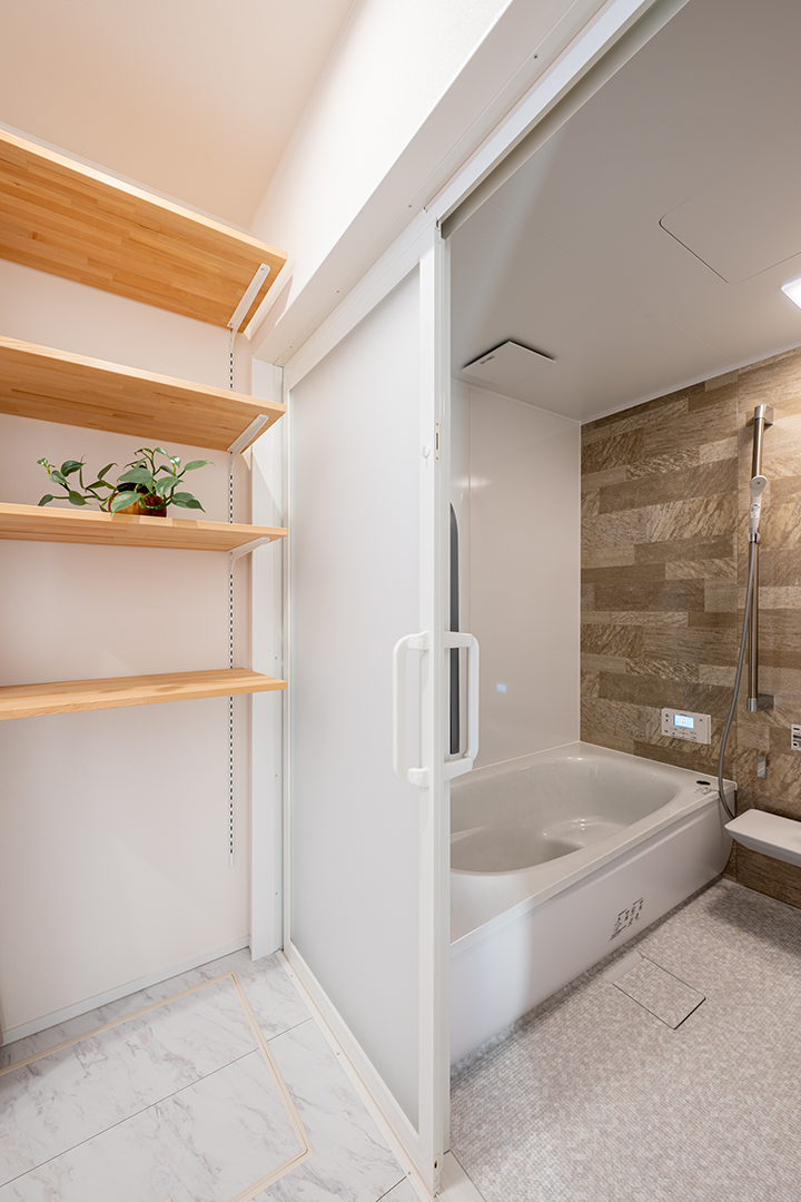 脱衣スペースには棚を取り付け、着替えなどを収納できます。