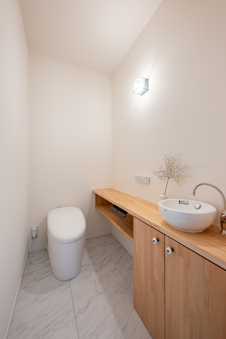 無垢材で手洗い収納を造作し、おしゃれで温かみのある空間に。
