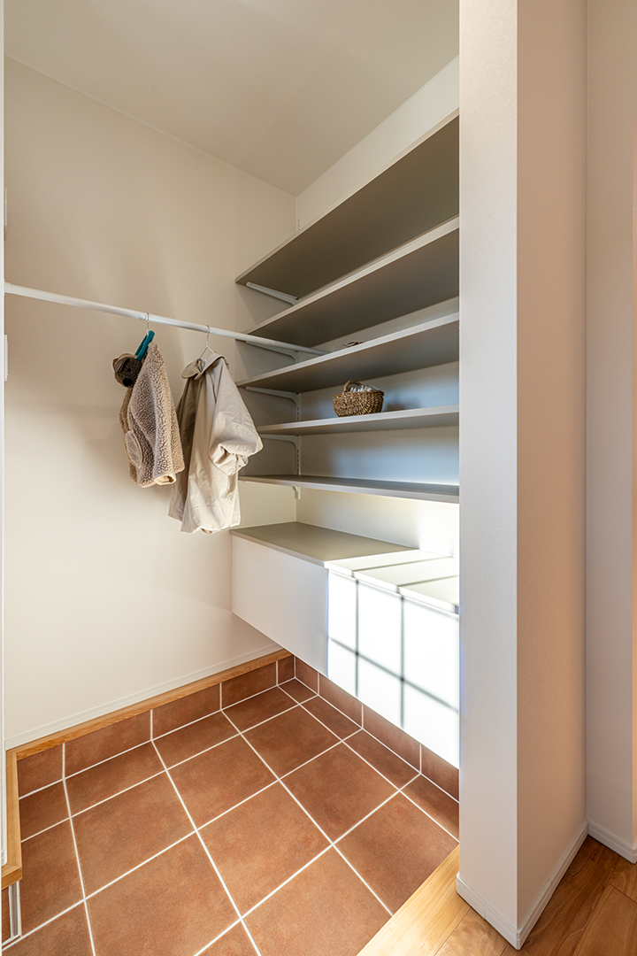 テラコッタ風タイルの温もりを感じる色合いが素敵な玄関。